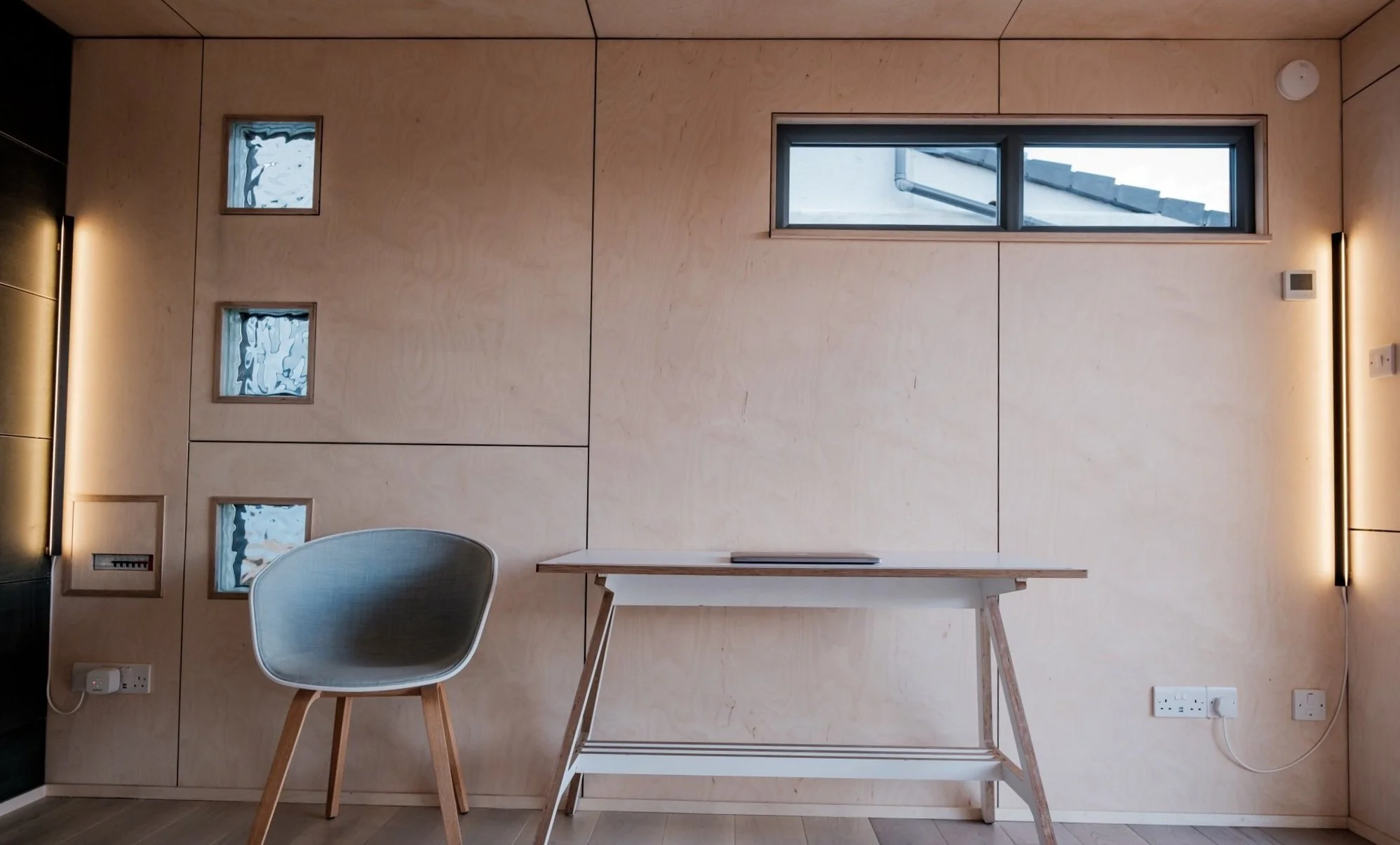 Externally covered in burnt larch and featuring shadow gap plywood walls internally, the studio seamlessly blends with its natural surroundings. The large bifold doors allow ample natural light and breathtaking views of the seascape. This cozy space offers a tranquil retreat for creativity, self-reflection, and inspiration, providing an escape from the hustle and bustle of daily life to immerse oneself in the beauty of the coastal landscape.